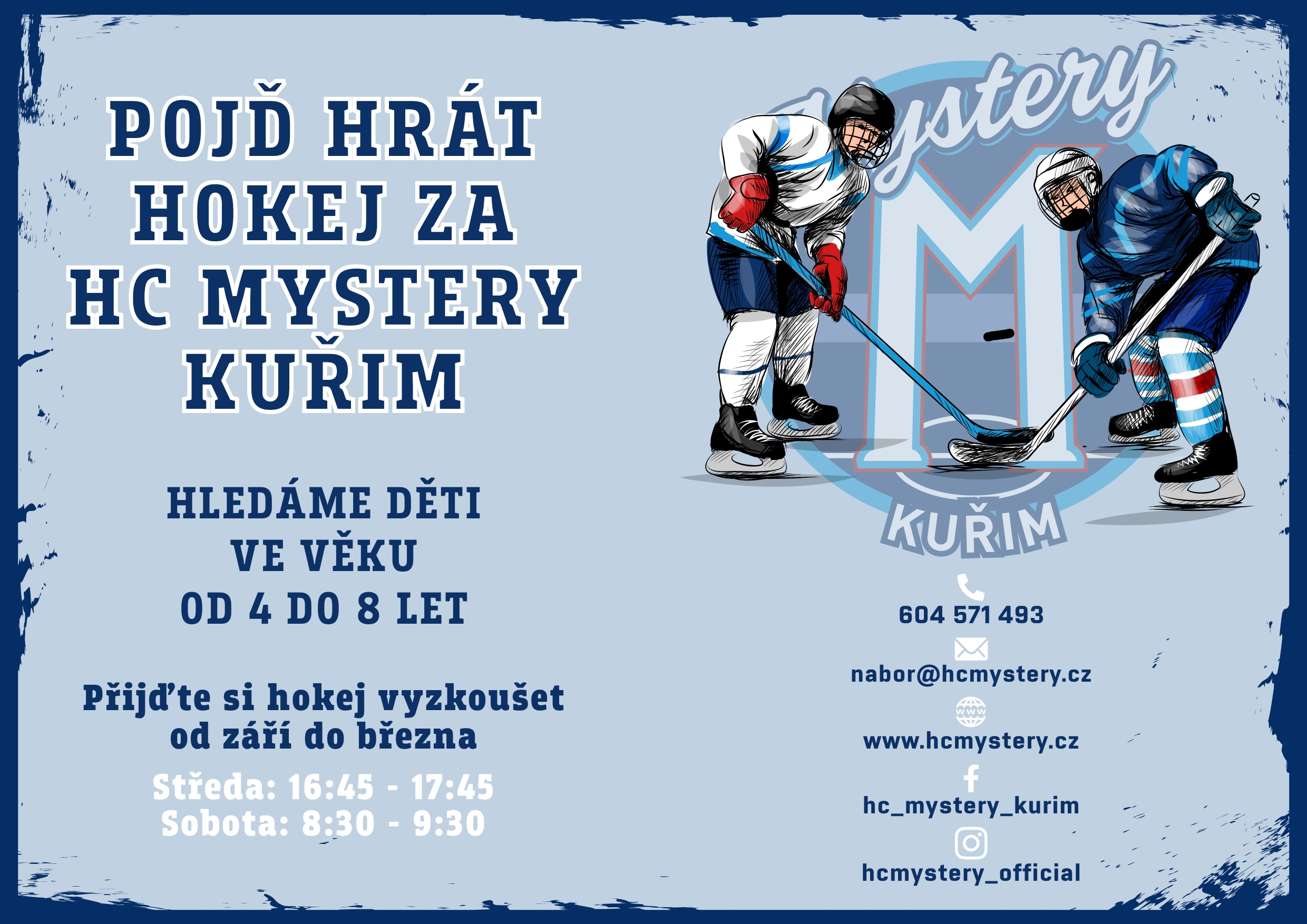 Hledáte pro Vaše dítě zábavu, hravost, nové kamarády, spoustu pohybu? Chcete, aby se naučilo bruslit a nejkrásnější hru na světě - lední hokej? Chcete pro Vaše dítě hodně všestranné pohybové aktivity?Tak přijďte mezi nás. Vyberte ten správný sport pro Vaše dítě. Máte možnost se stát součástí HC MYSTERY KUŘIM. V Mystery máme jasnou filozofii při výchově dětí. Víme že výuka hokeje je dlouhodobý, trpělivý výchovný proces. Dbáme na všestranný pohybový rozvoj dětí, hravost, podporujeme emoce, chytrost. Naším hlavním mottem v klubu je “BAV SE S NÁMI HOKEJEM”. Čeká na Vás zkušený tým trenérů, spousta zábavy a kamarádů.